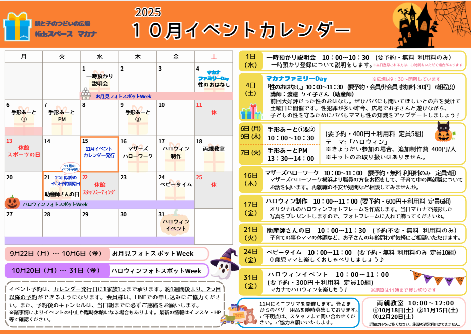 10月のイベントカレンダーです。