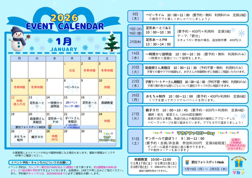 2026年1月のイベントカレンダーです。