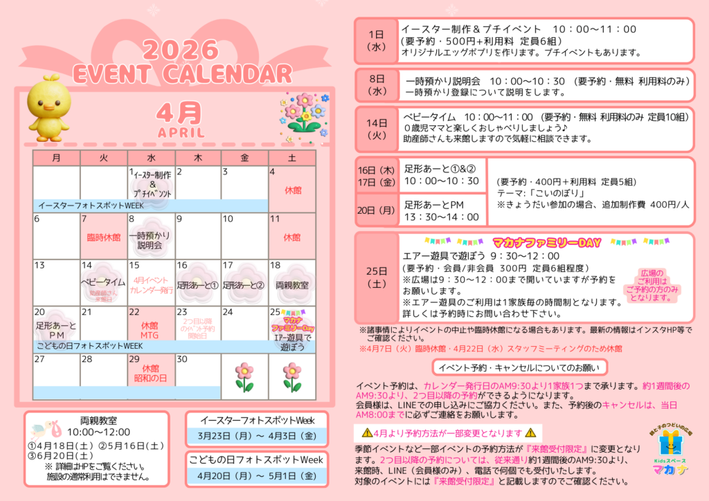 ◆イベント予約は、カレンダー発行日に1家族1つまで承ります。